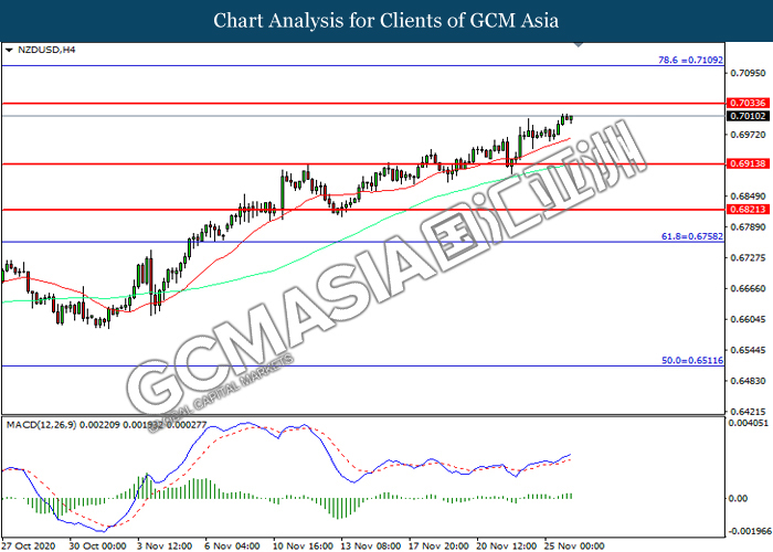 NZDUSD, H4: NZDUSD telah didagang dengan lebih tinggi sementara kini berhampiran dengan tahap rintangan 0.7035. MACD yang memaparkan momentum bullish mencadangkan pasangan ini untuk melanjutkan keuntungannya selepas ia memecah tahap rintangan tersebut.