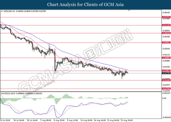 NZDUSD, H4: NZDUSD telah didagang dengan lebih rendah berikutan dengan pengunduran dari tahap rintangan 0.6395. MACD yang menunjukkan penyusutan pada momentum bullish mencadangkan pasangan ini untuk melanjutkan kerugiannya ke arah tahap sokongan 0.6330.