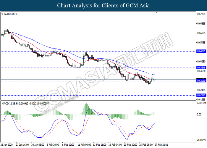 NZDUSD, H4: NZDUSD telah didagang dengan lebih rendah sementara ia sedang menguji tahap sokongan 0.6305. Namun, MACD yang memaparkan isyarat momentum bullish mencadangkan pasangan ini untuk mengalami pembetulan teknikal ke arah tahap rintangan 0.6385.
