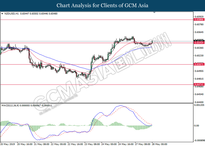 NZDUSD, H1: NZDUSD telah didagang dengan lebih tinggi berikutan dengan pemecahan dari tahap rintangan sebelumnya di 0.6545. MACD yang menunjukkan momentum bearish yang berkurangan mencadangkan pasangan ini untuk melanjutkan keuntungannya ke arah tahap rintangan di 0.6585.