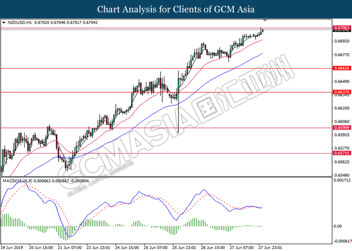 NZDUSD, H1: NZDUSD telah didagang dengan lebih tinggi sementara menguji pada tahap rintangan di 0.6705. Oleh kerana kekurangan isyarat daripada MACD, pengunduran atau pemecahan pada tahap rintangan tersebut adalah diperlukan bagi pengesahan yang selanjutnya sebelum memasuki pasaran.