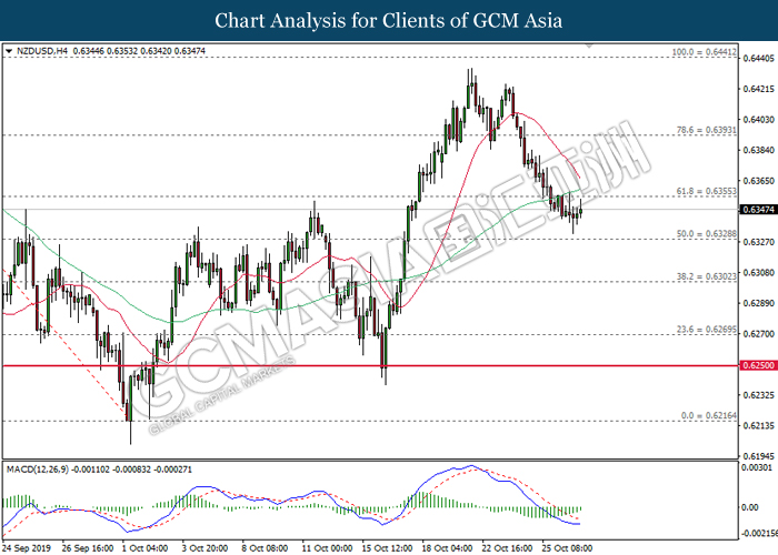 NZDUSD, H4: NZDUSD telah didagang dengan lebih tinggi selepas ia melantun dari tahap sokongan 0.6330. MACD yang memaparkan penyusutan pada momentum menurun mencadangkan pasangan ini untuk didagang dengan lebih tinggi bagi jangka pendek.