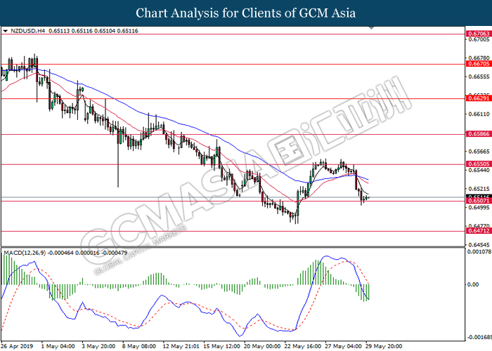 NZDUSD, H4: NZDUSD telah didagang dengan lebih tinggi berikutan dengan lantunan dari tahap sokongan di 0.6505. MACD yang menunjukkan momentum bearish yang berkurangan mencadangkan pasangan ini untuk melanjutkan lantunannya ke arah tahap rintangan di 0.6550.