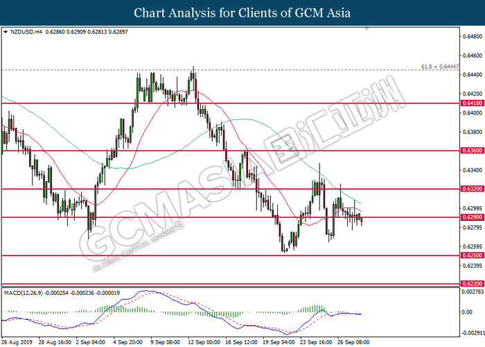 NZDUSD, H4: NZDUSD telah didagang dengan lebih tinggi sementara kini menguji di tahap rintangan 0.6290. MACD yang mula untuk membentuk isyarat bullish mencadangkan pasangan ini untuk meneruskan kenaikannya bagi jangka pendek selepas pemecahan berlaku di 0.6290.
