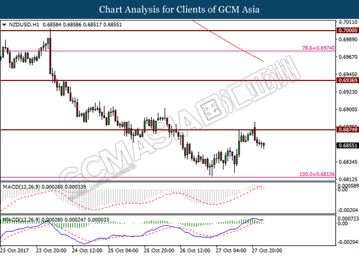 NZDUSD, H1: NZDUSD telah didagang dengan lebih rendah setelah ia gagal memecah tahap rintangan di 0.6875. Pembentukan lilin bearish engulfing dan silang kematian oleh garisan isyarat MACD memberi cadangan kepada pasangan tersebut untuk berdagang dengan lebih rendah ke arah tahap sokongan di 0.6815.