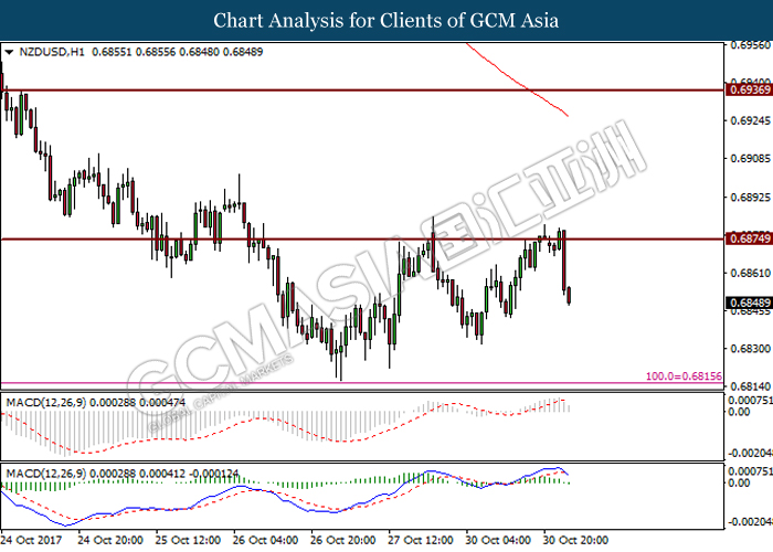 NZDUSD, H1: NZDUSD telah didagang dengan lebih rendah setelah ia gagal untuk memecah tahap rintangan di 0.6875. Pembentukan lilin bearish engulfing dan negative divergence oleh histogram MACD memberi cadangan kepada pasangan tersebut untuk melanjutkan kerugian ke tahap sokongan di 0.6815.