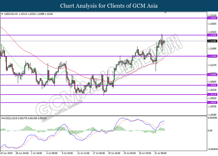 USDCAD, H4: USDCAD telah didagang dengan lebih rendah susulan dengan pengunduran dari tahap rintangan 1.3240. MACD yang memaparkan penyusutan pada momentum bullish mencadangkan pasangan ini untuk melanjutkan pengundurannya ke arah tahap sokongan 1.3160.