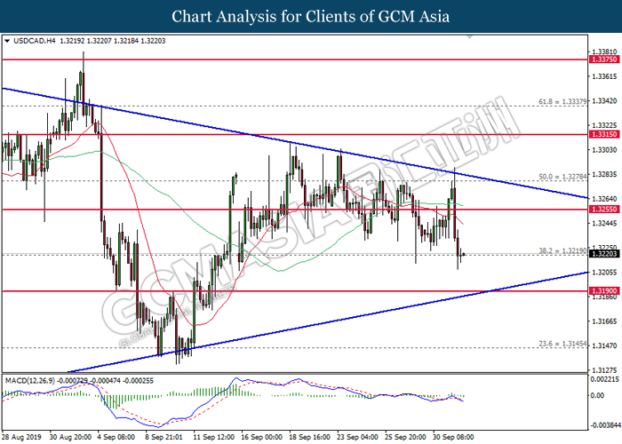 USDCAD, H4: USDCAD telah didagang dengan lebih rendah sementara kini menguji di tahap sokongan 1.3220. MACD yang memaparkan isyarat bearish mencadangkan pasangan ini untuk meneruskan kerugiannya selepas pemecahan berlaku di 1.3220.