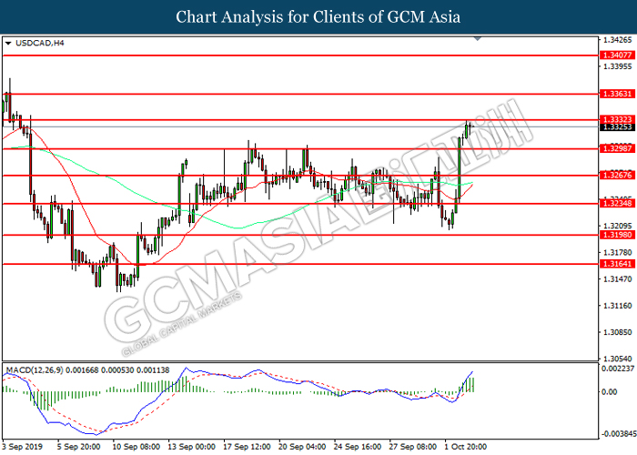 USDCAD, H4: USDCAD telah didagang dengan lebih tinggi selepas ia memecah tahap rintangan terdahulu 1.3300. MACD yang memaparkan momentum bullish mencadangkan pasangan ini untuk melanjutkan keuntungannya ke arah tahap rintangan 1.3335.