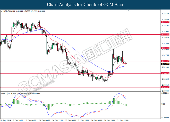 USDCAD, H4: USDCAD telah didagang dengan lebih rendah selepas ia memecah tahap sokongan sebelumnya 1.3145. MACD yang memaparkan momentum menurun mencadangkan pasangan ini untuk melanjutkan kerugiannya ke arah tahap sokongannya di 1.3085.