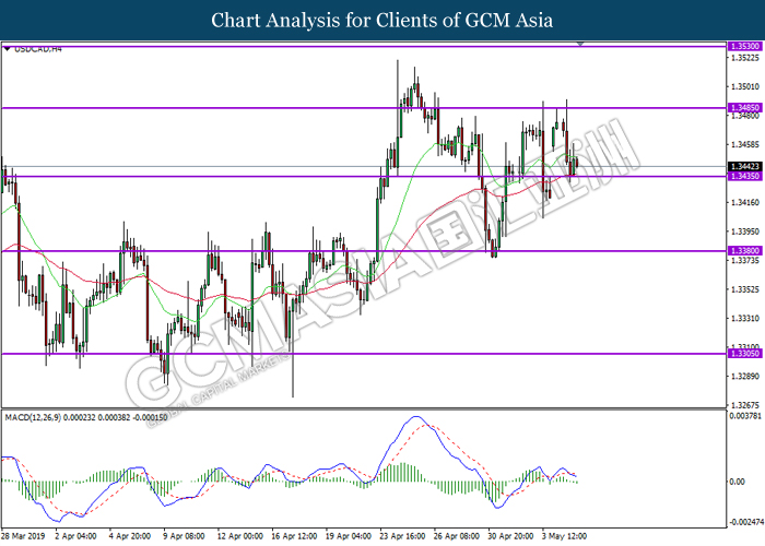 USDCAD, H4: USDCAD telah didagang dengan lebih rendah sementara menguji berdekatan tahap sokongan di 1.3425. MACD yang memaparkan momentum bearish dengan formasi silang kematian mencadangkan pasangan ini untuk melanjutkan kerugiannya selepas ia berjaya untuk memecahkan pada tahap sokongan tersebut.
