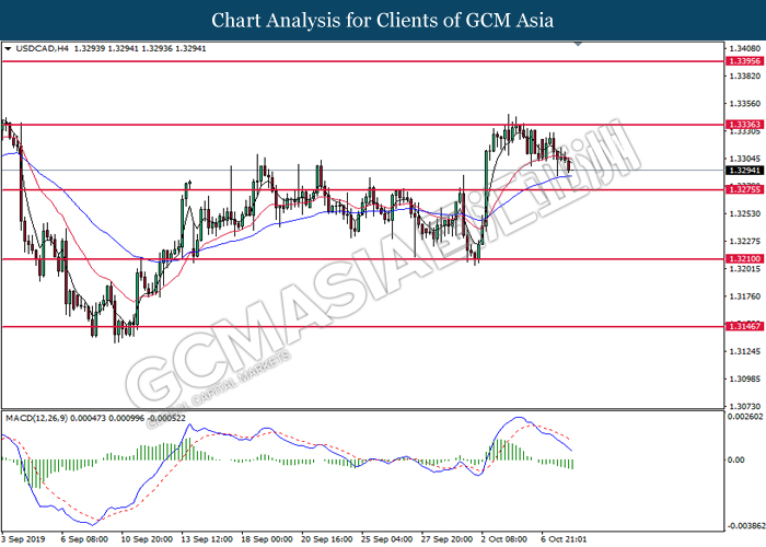 USDCAD, H4: USDCAD telah didagang dengan lebih rendah selepas ia berundur dari tahap rintangan 1.3335. MACD yang memaparkan isyarat bearish mencadangkan pasangan ini untuk didagang dengan lebih rendah dan menuju ke arah tahap sokongan 1.3275.