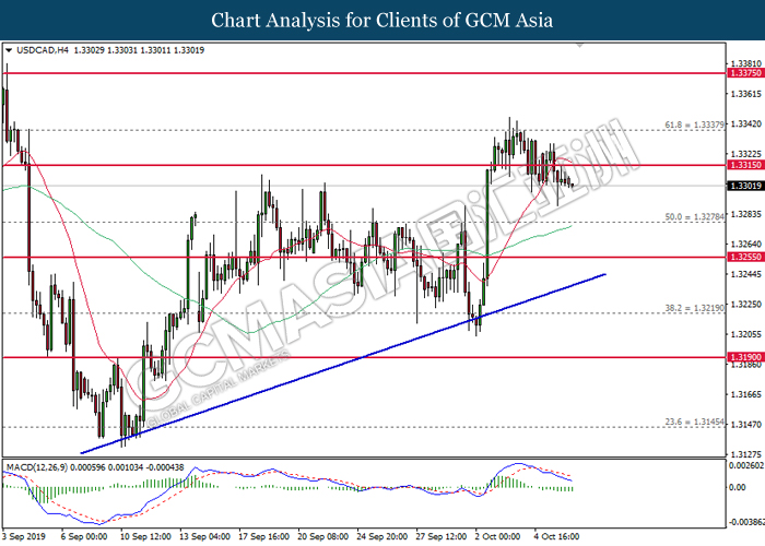USDCAD, H4: USDCAD telah didagang dengan lebih rendah selepas ia memecahkan sasaran di 1.3315. MACD yang memaparkan isyarat bearish mencadangkan pasangan ini untuk didagang dengan lebih rendah bagi jangka pendek sebagai pembetulan teknikal.