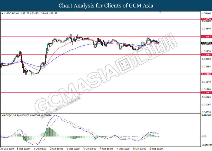 USDCAD, H4: USDCAD telah didagang dengan lebih rendah selepas ia berundur dari tahap rintangan 1.3335. MACD yang memaparkan isyarat bearish mencadangkan pasangan ini untuk didagang dengan lebih rendah dan menuju ke arah tahap sokongan 1.3275.