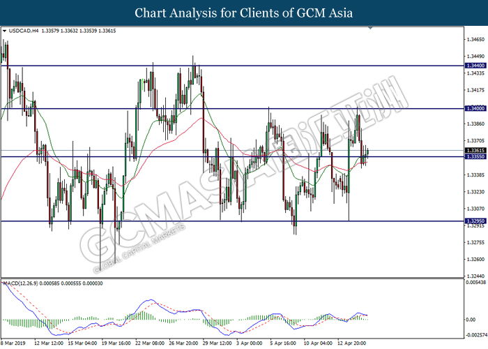 USDCAD, H4: USDCAD telah didagang dengan lebih tinggi susulan dengan lantunan dari tahap sokongan di 1.3355. Namun, MACD yang menunjukkan isyarat bias bearish serta formasi silang kematian mencadangkan pasangan ini untuk mengalami pembetulan teknikal jangka pendek dan berundur kembali ke arah tahap sokongan di 1.3355.