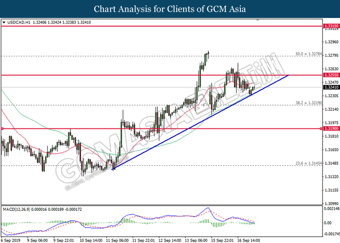 USDCAD, H1: USDCAD telah didagang dengan lebih tinggi selepa sia melantun dari garisan trend menaik. MACD yang memaparkan penyusutan pada momentum menurun mencadangkan pasangan ini untuk meneruskan kenaikan bagi jangka pendek.