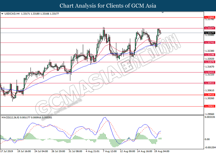 USDCAD, H4: USDCAD telah didagang dengan lebih rendah berikutan dengan pengunduran dari tahap rintangan 1.3340. MACD yang menunjukkan penyusutan pada momentum bullish mencadangkan pasangan ini untuk melanjutkan pengundurannya ke arah tahap sokongan 1.3275.