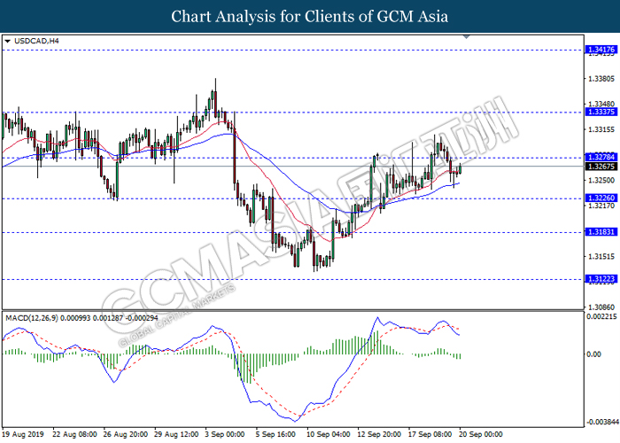 USDCAD, H4: USDCAD telah didagang dengan lebih tinggi sementara ia sedang menguji berhampiran dengan tahap rintangan 1.3280. MACD yang memaparkan isyarat momentum bearish yang berkurangan mencadangkan pasangan ini untuk melanjutkan keuntungannya selepas ia memecah tahap rintangan tersebut.