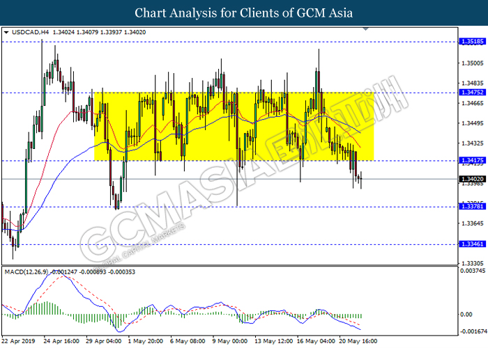 USDCAD, H4: USDCAD telah didagang dengan lebih rendah berikutan dengan pemecahan dari tahap sokongan sebelumnya di 1.3415. MACD yang memaparkan momentum bearish yang berterusan mencadangkan pasangan ini untuk melanjutkan kerugiannya ke arah tahap sokongan di 1.3380.