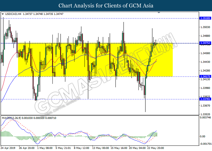 USDCAD, H4: USDCAD kekal didagang dalam saluran sisi sementara menguji semula pada tahap rintangan di 1.3475. Namun, MACD yang menunjukkan momentum bullish yang berkurangan mencadangkan pasangan ini untuk didagang dengan lebih rendah ke arah tahap sokongan 1.3415.