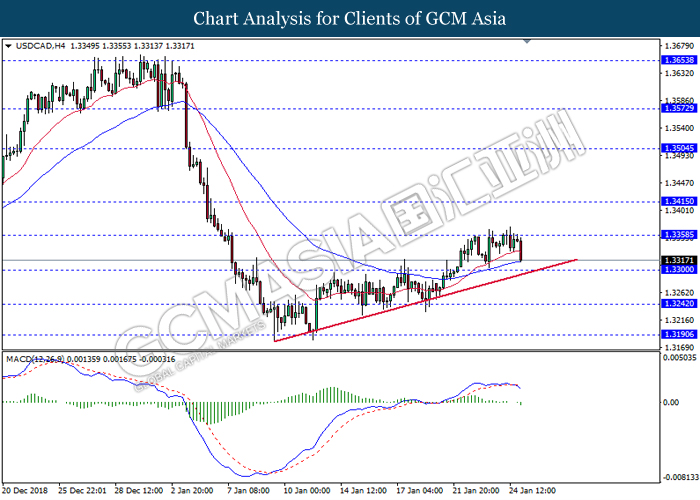 USDCAD, H4: USDCAD telah didagang dengan lebih rendah berikutan dengan pengunduran dari tahap rintangan 1.3360. MACD yang memaparkan momentum bearish mencadangkan pasangan ini untuk melanjutkan kerugiannya ke arah tahap sokongan 1.3300.