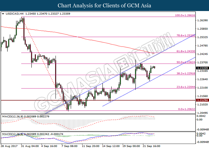USDCAD, H4: USDCAD telah didagang dengan lebih tinggi selepas memecahkan tahap sokongan di 1.2290. Pembentukan silang emas yang dipaparkan oleh garisan isyarat MACD memberi cadangan kepada pasangan tersebut untuk melanjutkan keuntungan ke arah tahap rintangan di 1.2360.