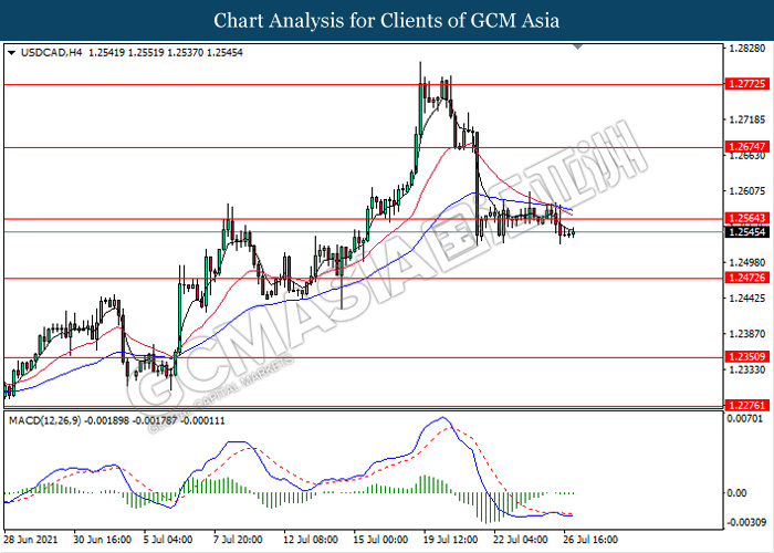 USDCAD, H4: USDCAD telah didagang dengan lebih rendah susulan dengan pemecahan pada tahap sokongan sebelumnya 1.2565. MACD yang memaparkan isyarat bias bearish mencadangkan pasangan ini untuk melanjutkan kerugiannya ke arah tahap sokongan 1.2470.