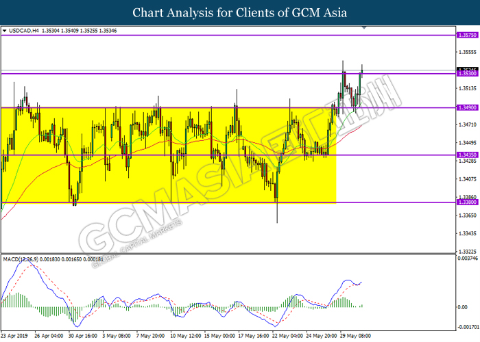 USDCAD, H4: USDCAD telah didagang dengan lebih tinggi sementara menguji pada tahap rintangan di 1.3530. MACD yang memaparkan momentum bullish mencadangkan pasangan ini untuk melanjutkan keuntungannya selepas ia berjaya untuk memecahkan pada tahap rintangan tersebut.