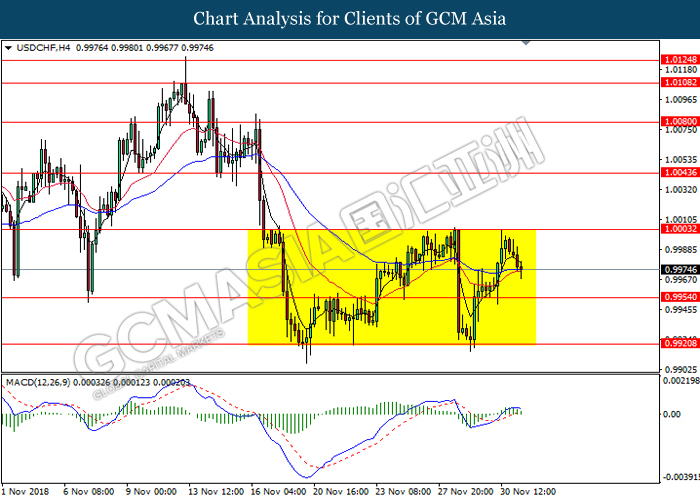 USDCHF, H4: USDCHF telah didagang dengan lebih rendah selepas ia berundur dari tahap rintangan 1.0000. MACD yang memaparkan pembentukan isyarat silang kematian mencadangkan pasangan ini untuk menurun selanjutnya bagi jangka pendek dan menuju ke arah 0.9955.