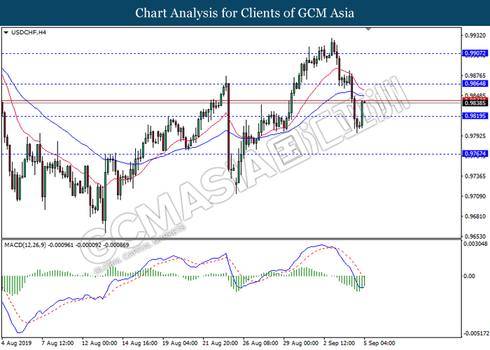 USDCHF, H4: USDCHF telah didagang dengan lebih tinggi berikutan dengan pemecahan pada tahap rintangan sebelumnya 0.9820. MACD yang memaparkan isyarat momentum bearish yang telah berkurangan mencadangkan pasangan ini untuk melanjutkan keuntungannya ke arah tahap rintangan 0.9865.