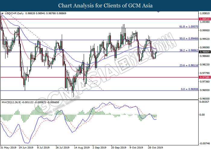 USDCHF, Daily: USDCHF telah didagang dengan lebih tinggi sementara ia sedang menguji tahap rintangan 0.9885. MACD yang memaparkan momentum bearish yang berkurangan mencadangkan pasangan ini untuk melanjutkan keuntungannya selepas ia berjaya memecah tahap rintangan tersebut.