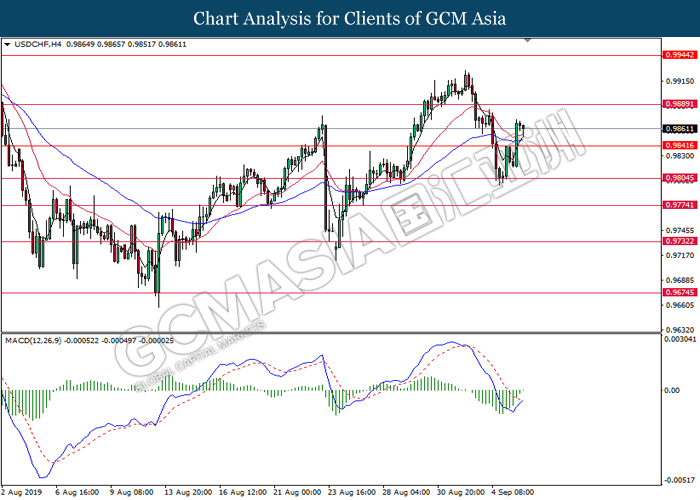 USDCHF, H4: USDCHF telah didagang dengan lebih tinggi selepas ia memecahkan tahap rintangan di 0.9840. MACD yang memaparkan penyusutan pada momentum bearish mencadangkan pasangan ini untuk meningkat dan menuju ke arah 0.9890.