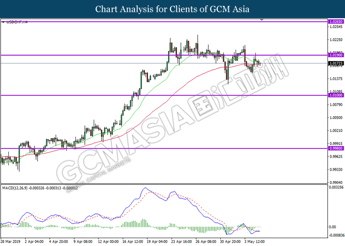 USDCHF, H4: USDCHF telah didagang dengan lebih rendah susulan dengan pengunduran dari tahap rintangan di 1.0190. MACD yang menunjukkan isyarat bias bearish mencadangkan pasangan ini untuk melanjutkan pengundurannya ke arah tahap sokongan di 1.0100.