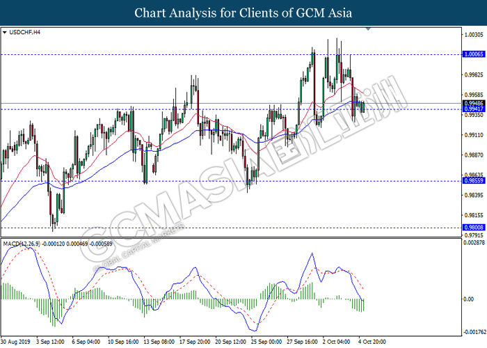 USDCHF, H4: USDCHF telah didagang dengan lebih rendah sementara ia sedang menguji berhampiran dengan tahap sokongan 0.9940. Namun, MACD yang memaparkan isyarat momentum bearish yang telah berkurangan mencadangkan pasangan ini untuk mengalami pembetulan teknikal dalam jangka pendek ke arah tahap rintangan 1.0005.