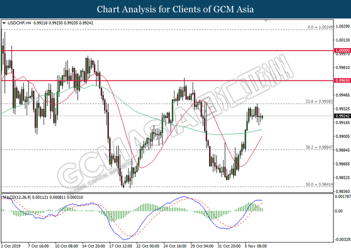 USDCHF, H4: USDCHF telah didagang dengan lebih rendah selepas ia berundur dari tahap rintangan 0.9940. MACD yang memaparkan penyusutan pada momentum menaik mencadangkan pasangan ini untuk didagang dengan lebih rendah bagi jangka pendek.