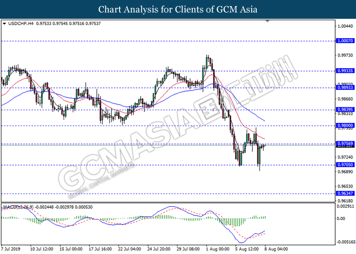 USDCHF, H4: USDCHF telah didagang dengan lebih tinggi sementara menguji pada tahap rintangan 0.9755. MACD yang memaparkan isyarat momentum bullish mencadangkan pasangan ini untuk melanjutkan keuntungannya selepas ia berjaya untuk memecahkan pada tahap rintangan tersebut.