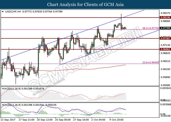 USDCHF, H4: USDCHF telah didagang dengan lebih rendah selepas ia gagal untuk memecahkan tahap rintangan di 0.9820. Pembentukan candlestick pin bar bearish dan negative divergence yang dipaparkan oleh histogram MACD memberi cadangan kepada pasangan tersebut lebih cenderung untuk berdagang dengan lebih rendah. Namun, pemecahan ke bawah tahap sokongan di 0.9775 diperlukan demi pasangan tersebut mendapat momentum yang lebih ketara untuk berdagang dengan lebih rendah ke arah tahap sokongan yang seterusnya di 0.9740.