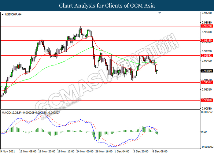 USDCHF, H4: USDCHF telah didagang dengan lebih rendah selepas ia berundur dari tahap rintangan 0.9260. MACD yang memaparkan momentum bearish mencadangkan pasangan ini untuk melanjutkan kerugiannya ke arah tahap sokongan 0.9155.
