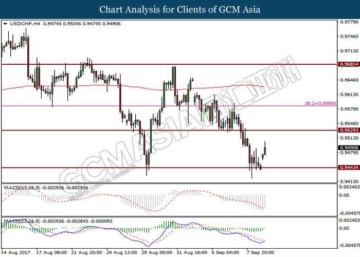 USDCHF, H4: USDCHF telah didagang dengan lebih tinggi selepas ia melantun dari tahap sokongan pada 0.9445. Susutan pada histogram MACD memberi cadangan kepada pasangan tersebut untuk berdagang dengan lebih tinggi ke arah tahap rintangan pada 0.9530.