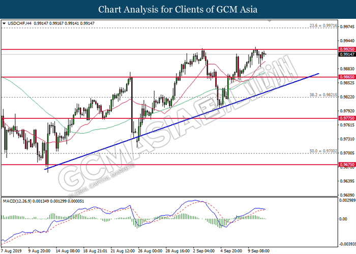 USDCHF, H4: USDCHF telah didagang dengan lebih rendah selepas ia berundur dari tahap rintangan 0.9925. MACD yang mula untuk membentuk isyarat bearish mencadangkan pasangan ini untuk didagang dengan lebih rendah bagi jangka pendek sebagai pembetulan teknikal.