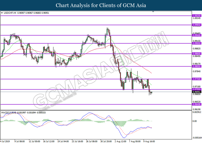 USDCHF, H4: USDCHF telah didagang dengan lebih rendah susulan dengan pemecahan dari tahap sokongan sebelumnya di 0.9705. MACD yang memaparkan momentum bearish dengan formasi silang kematian mencadangkan pasangan ini untuk melanjutkan kerugiannya ke arah tahap sokongan 0.9640.