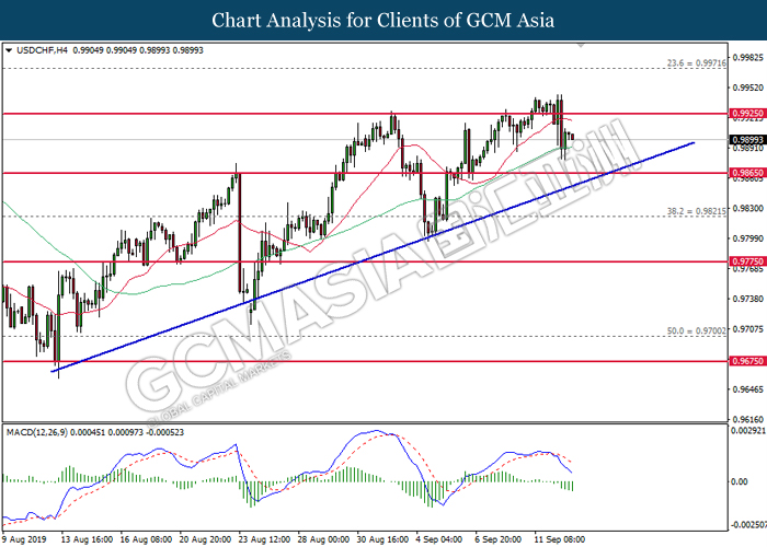 USDCHF, H4: USDCHF telah didagang dengan lebih rendah selepa sia berundur dari paras tingginya. MACD yang memaparkan isyarat bearish mencadangkan pasangan ini untuk didagang dengan lebih rendah bagi jangka pendek sebagai pembetulan teknikal.