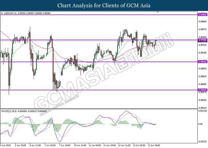 USDCHF, H1: USDCHF telah didagang dengan lebih tinggi sementara menguji pada tahap rintangan di 0.9940. MACD yang menunjukkan isyarat bias bullish mencadangkan pasangan ini untuk melanjutkan keuntungannya selepas ia berjaya untuk memecahkan pada tahap rintangan tersebut.