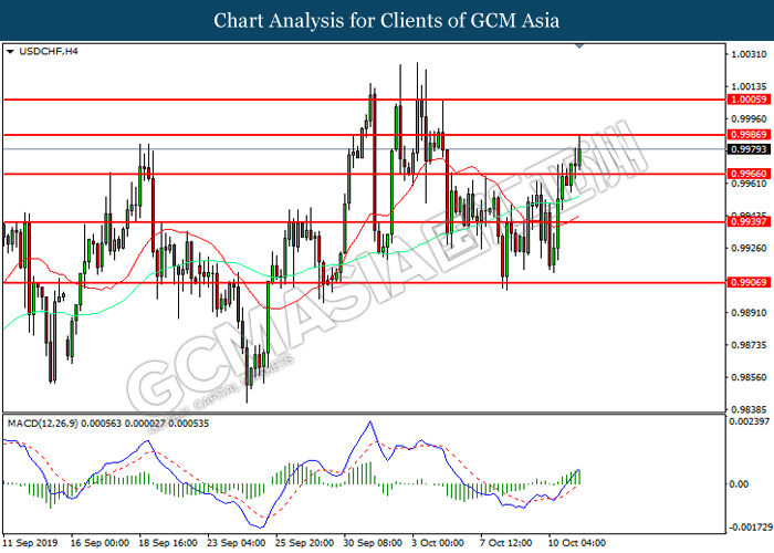USDCHF, H4: USDCHF telah didagang dengan lebih tinggi selepas ia memecah tahap rintangan terdahulu 0.9965. MACD yang memaparkan momentum bullish mencadangkan pasangan ini untuk melanjutkan keuntungannya ke arah tahap rintangan 0.9985.