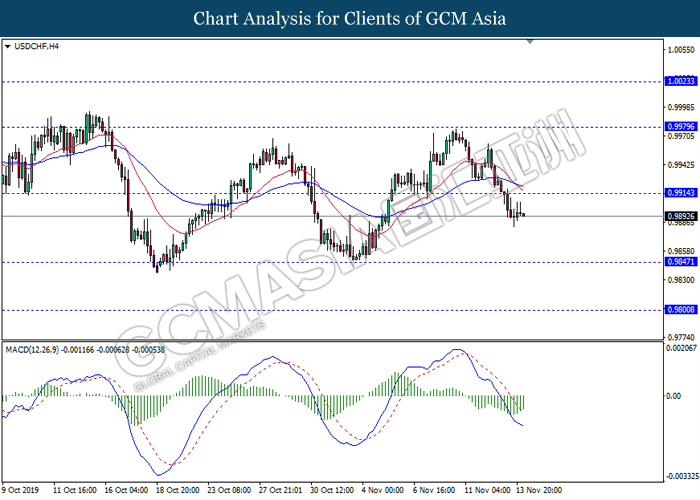 USDCHF, H4: USDCHF telah didagang dengan lebih rendah berikutan dengan pemecahan pada tahap sokongan sebelumnya 0.9915. Namun, MACD yang memaparkan isyarat momentum bearish yang berkurangan mencadangkan pasangan ini untuk mengalami pembetulan teknikal dalam jangka pendek ke arah tahap sokongan terkini 0.9915.