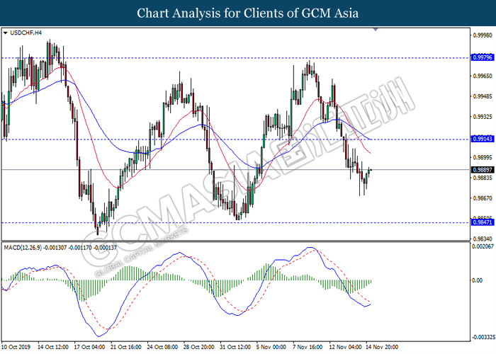 USDCHF, H4: USDCHF telah didagang dengan lebih tinggi berikutan dengan lantunan dari paras rendahnya. MACD yang memaparkan isyarat momentum bearish yang telah berkurangan mencadangkan pasangan in untuk melanjutkan lantunannya ke arah tahap rintangan 0.9915.