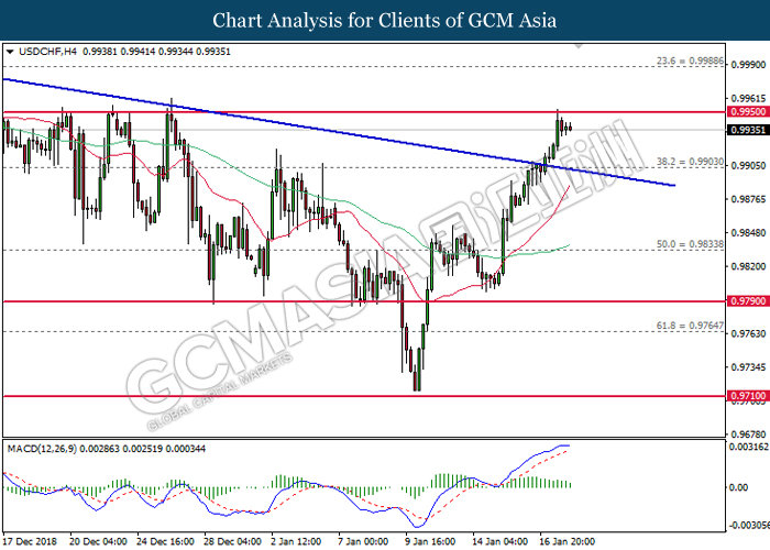 USDCHF, H4: USDCHF telah didagang dengan lebih rendah selepas ia berundur dari tahap rintangan 0.9950. MACD yang memaparkan penyusutan pada momentum menaik mencadangkan pasangan ini untuk didagang dengan lebih rendah bagi jangka pendek sebagai pembetulan teknikal.