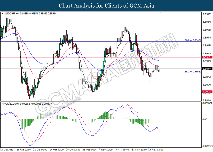 USDCHF, H4: USDCHF telah didagang dengan lebih tinggi berikutan dengan lantunan berlaku di 0.9885. MACD yang memaparkan isyarat bullish mencadangkan pasangan ini untuk melanjutkan keuntungannya ke arah tahap rintangan 0.9915.