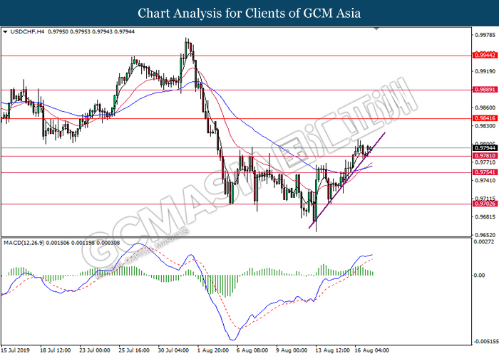 USDCHF, H4: USDCHF telah didagang dengan lebih tinggi susulan dengan lantunan dari garisan trend menaik. Namun, MACD yang memaparkan penyusutan pada momentum bullish mencadangkan pasangan ini untuk didagang dengan lebih rendah ke arah tahap sokongan 0.9780.