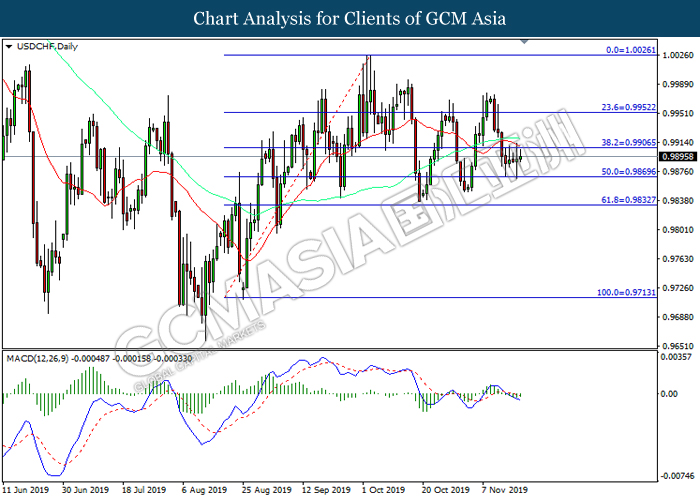 USDCHF, Daily: USDCHF telah didagang dengan lebih tinggi selepas ia melantun dari tahap sokongan 0.9870. Namun, MACD yang memaparkan momentum bearish mencadangkan pasangan ini untuk mengalami pembetulan teknikal bagi jangka pendek.